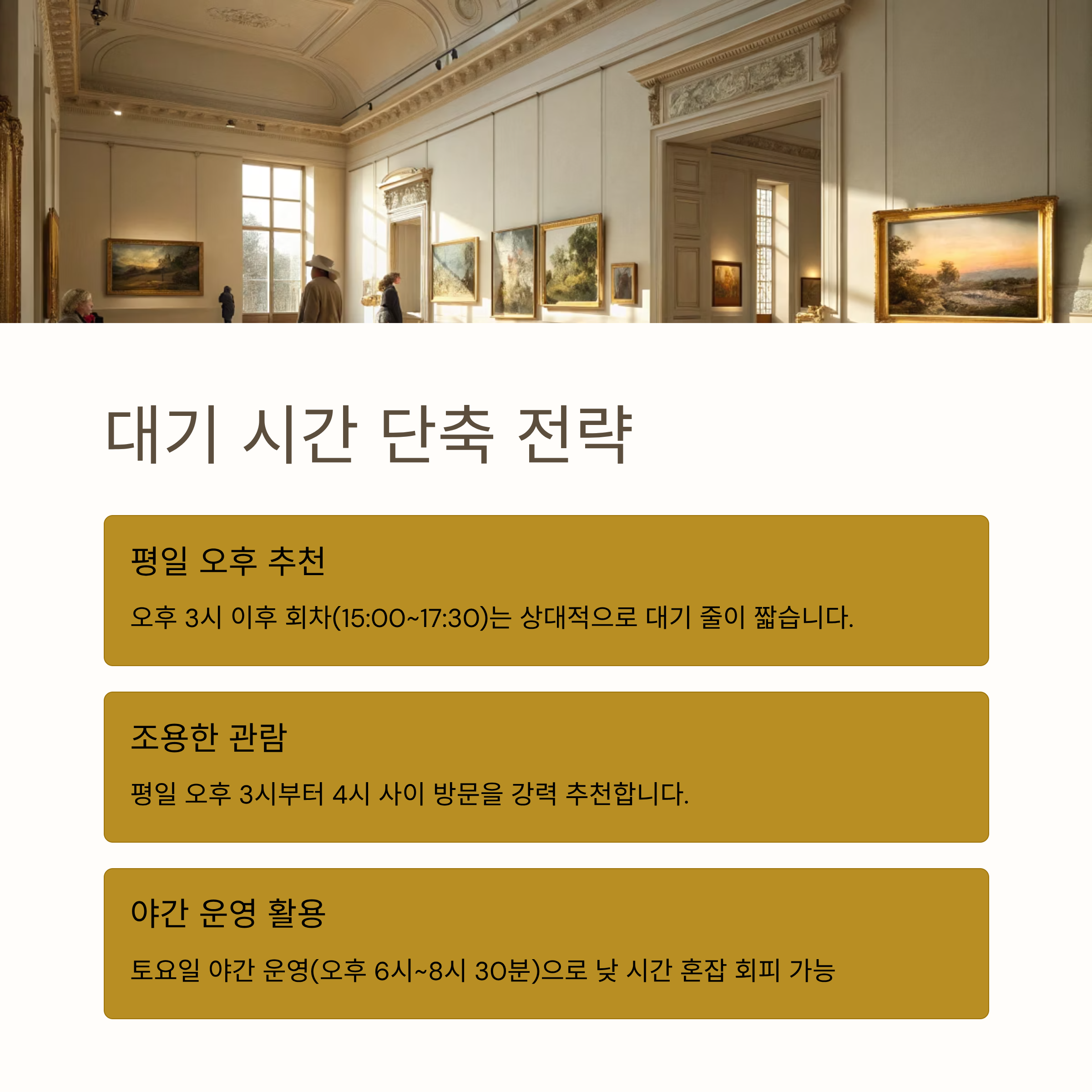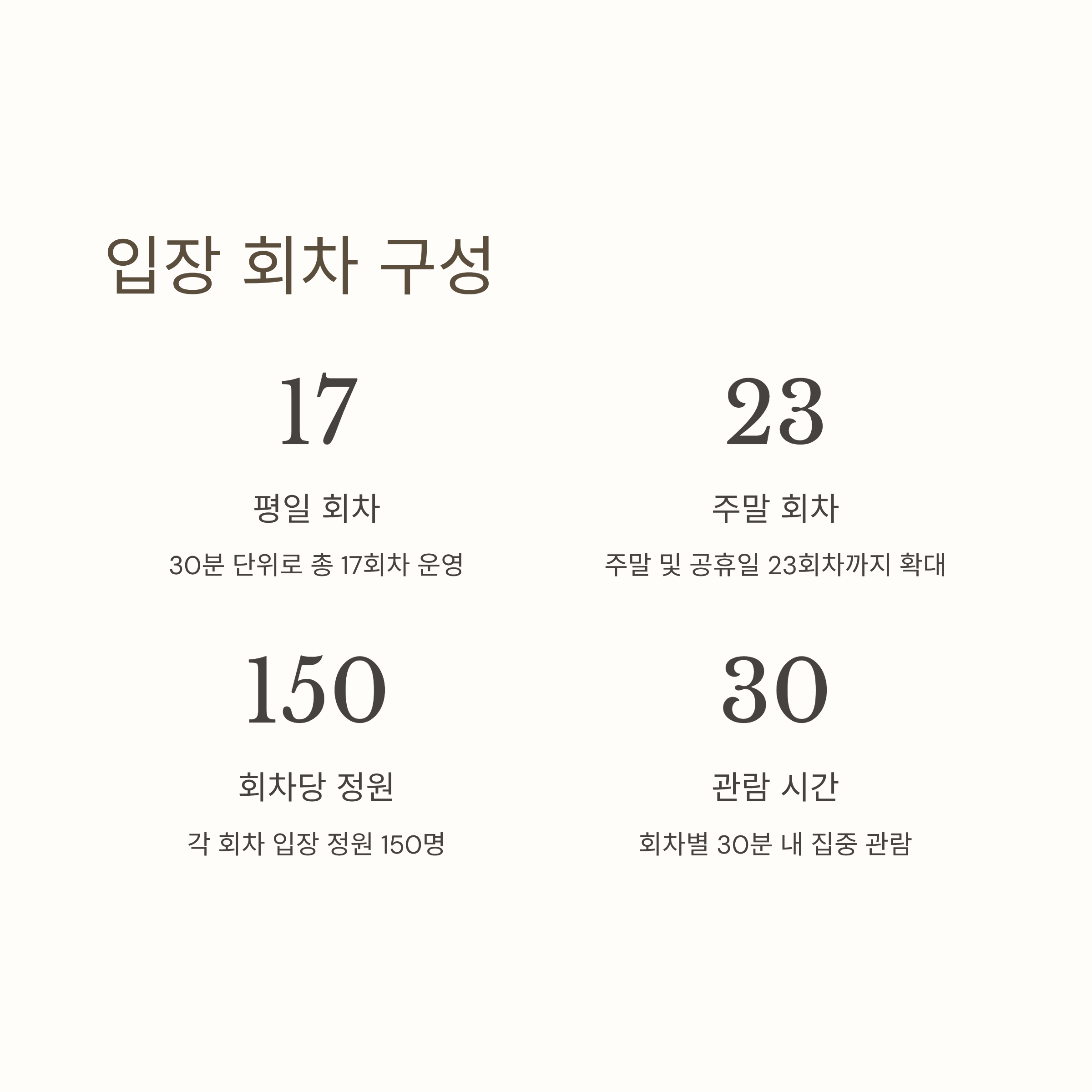 평일 오후 3시 이후 회차(15:00~17:30)는 상대적으로 대기 줄이 짧은 시간대입니다. 조용히 감상하고 싶으시다면 평일 오후 3시부터 4시 사이 방문을 강력 추천드립니다. 또한 토요일 야간 운영(오후 6시~8시 30분)을 활용하면 낮 시간 혼잡을 피할 수 있습니다.
