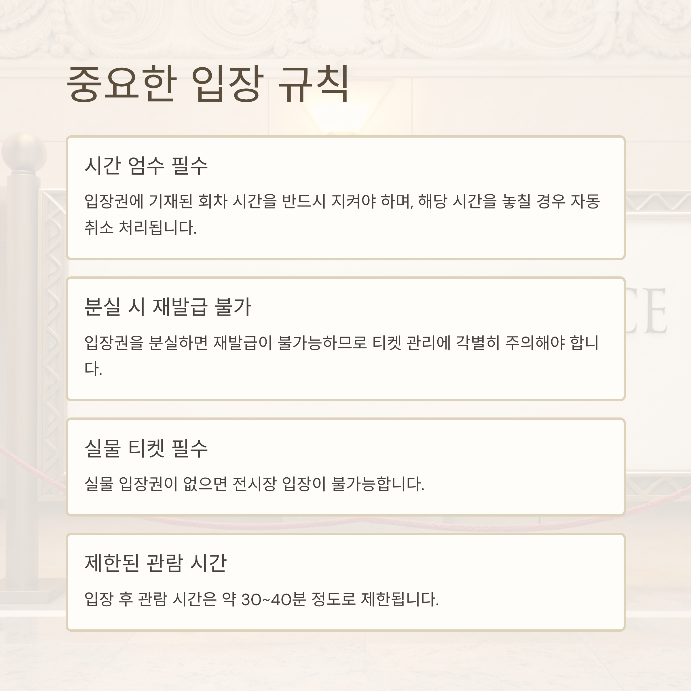 - 입장권에 기재된 회차 시간을 반드시 지켜야 하며, 해당 시간을 놓칠 경우 자동 취소 처리됩니다.