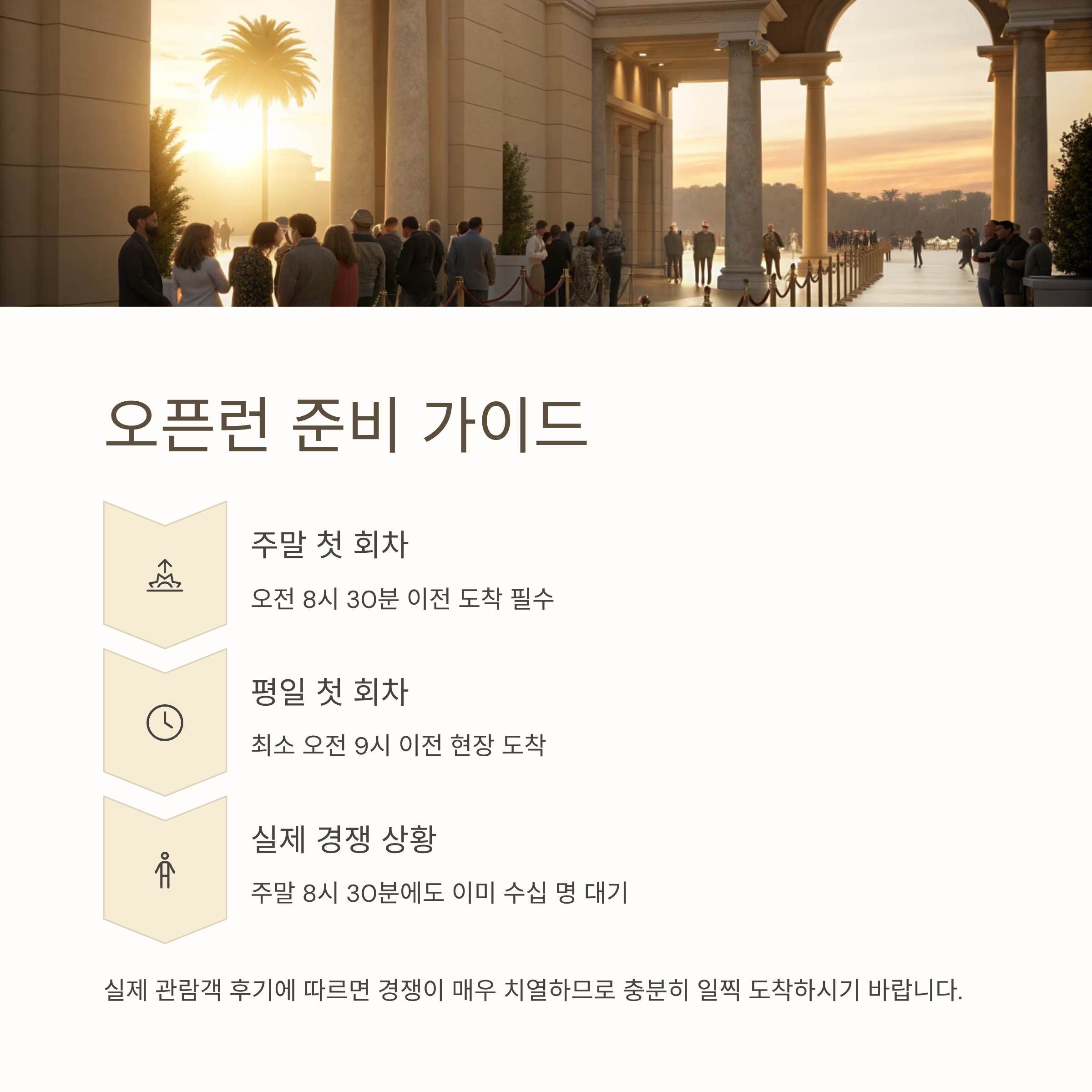 주말에 첫 회차(오전 9시 30분)를 확보하기 위해서는 오전 8시 30분 이전에 도착해야 합니다. 평일 첫 회차를 원한다면 최소 오전 9시 이전에 현장에 있어야 입장권을 받을 수 있습니다. 실제 관람객 후기에 따르면, 주말에는 8시 30분 이전 도착에도 이미 수십 명이 줄을 서 있을 정도로 경쟁이 치열합니다.
