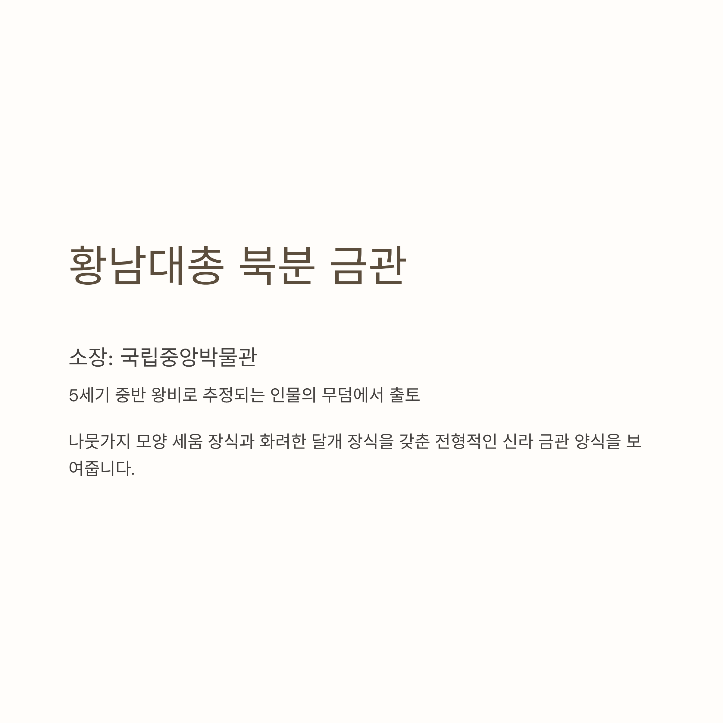 5세기 중반 왕비로 추정되는 인물의 무덤에서 출토되었으며, 나뭇가지 모양 세움 장식과 화려한 달개 장식을 갖춘 전형적인 신라 금관 양식을 보여줍니다. - 금관총 금관 - 국립경주박물관 소장
