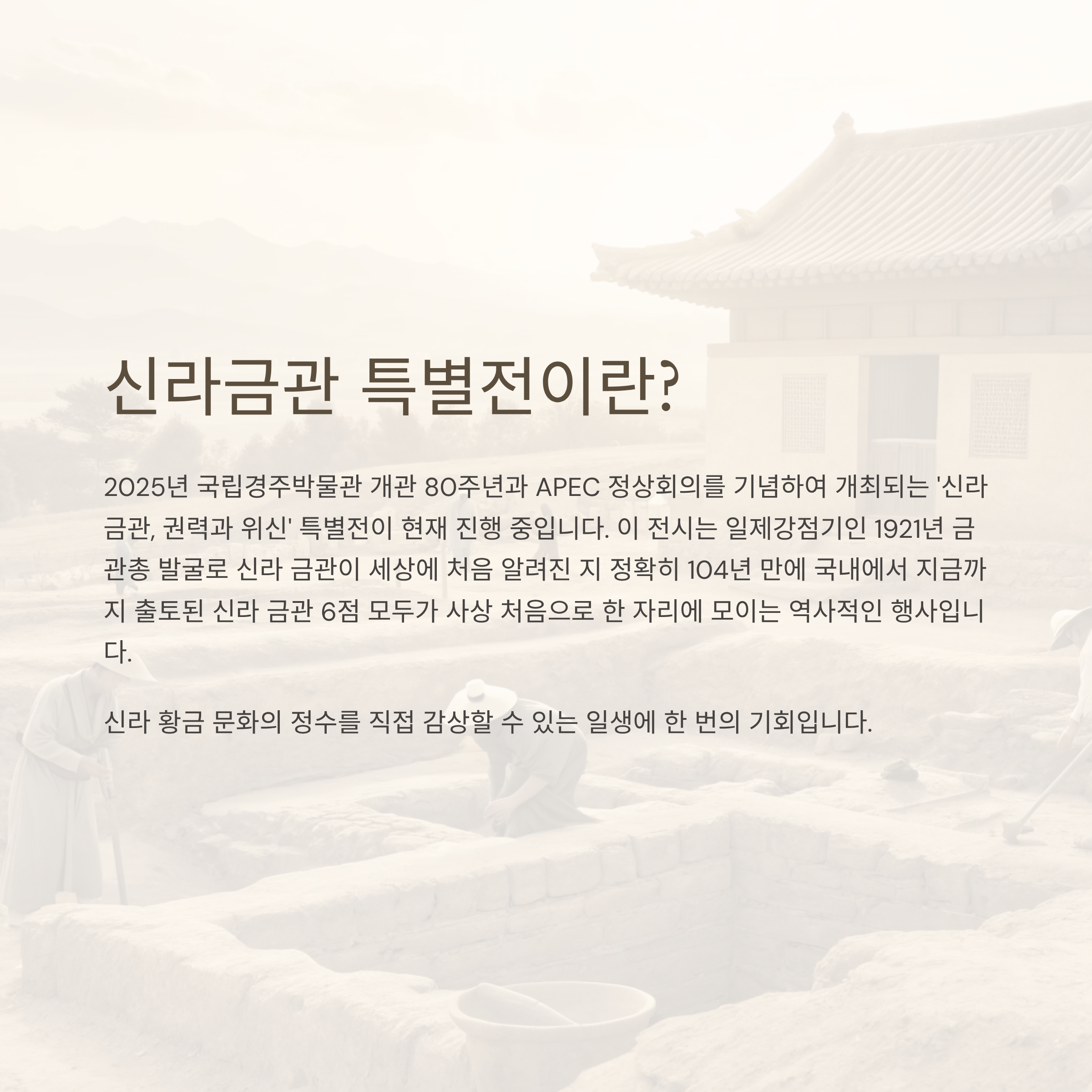 2025년 국립경주박물관 개관 80주년과 APEC 정상회의를 기념하여 개최되는 '신라 금관, 권력과 위신' 특별전이 현재 진행 중입니다.