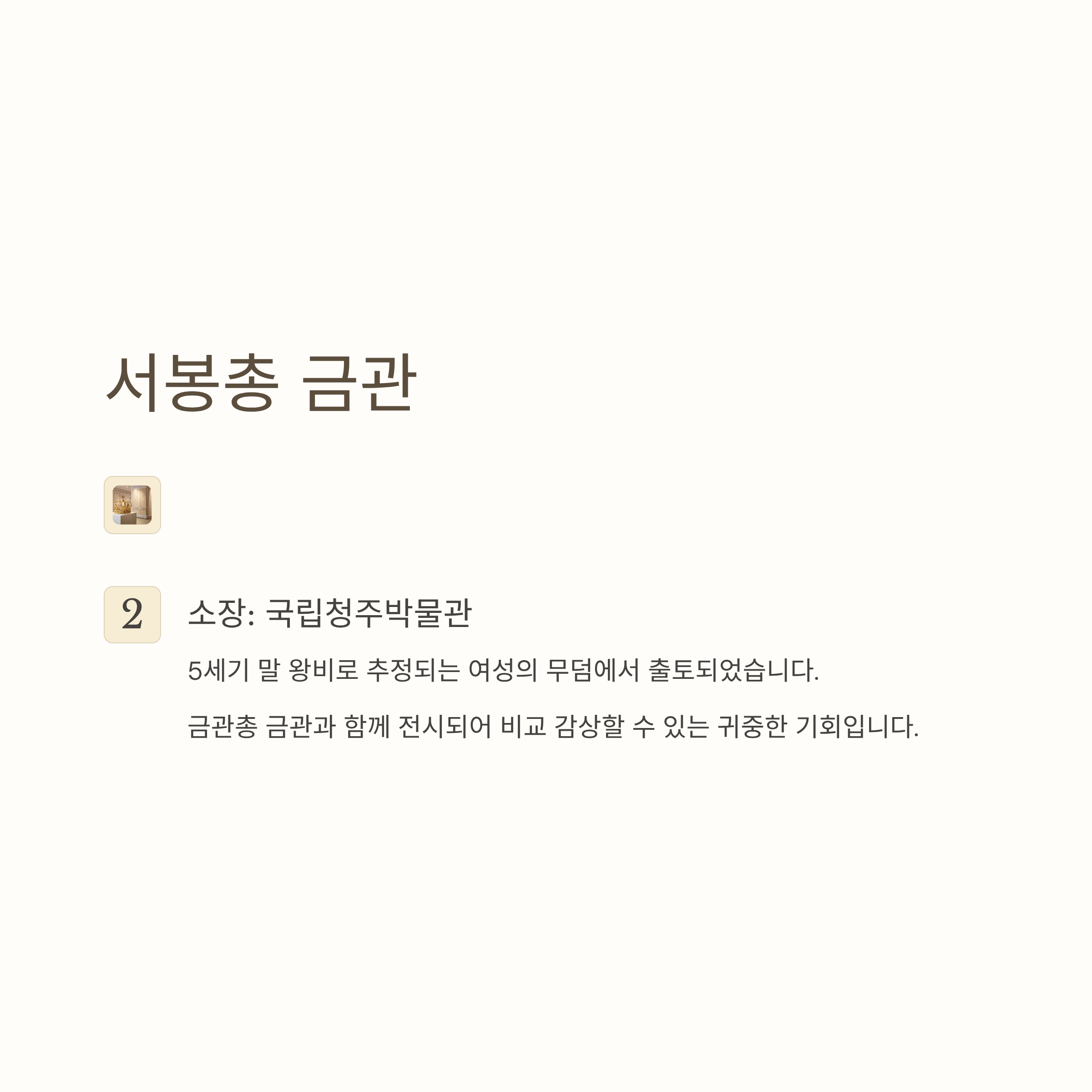 1921년 일제강점기에 처음 발굴되어 신라 금관이 세상에 알려지게 한 역사적 유물입니다. 5세기 후반 왕으로 추정되는 인물의 무덤에서 출토되었습니다. - 서봉총 금관 - 국립청주박물관 소장
