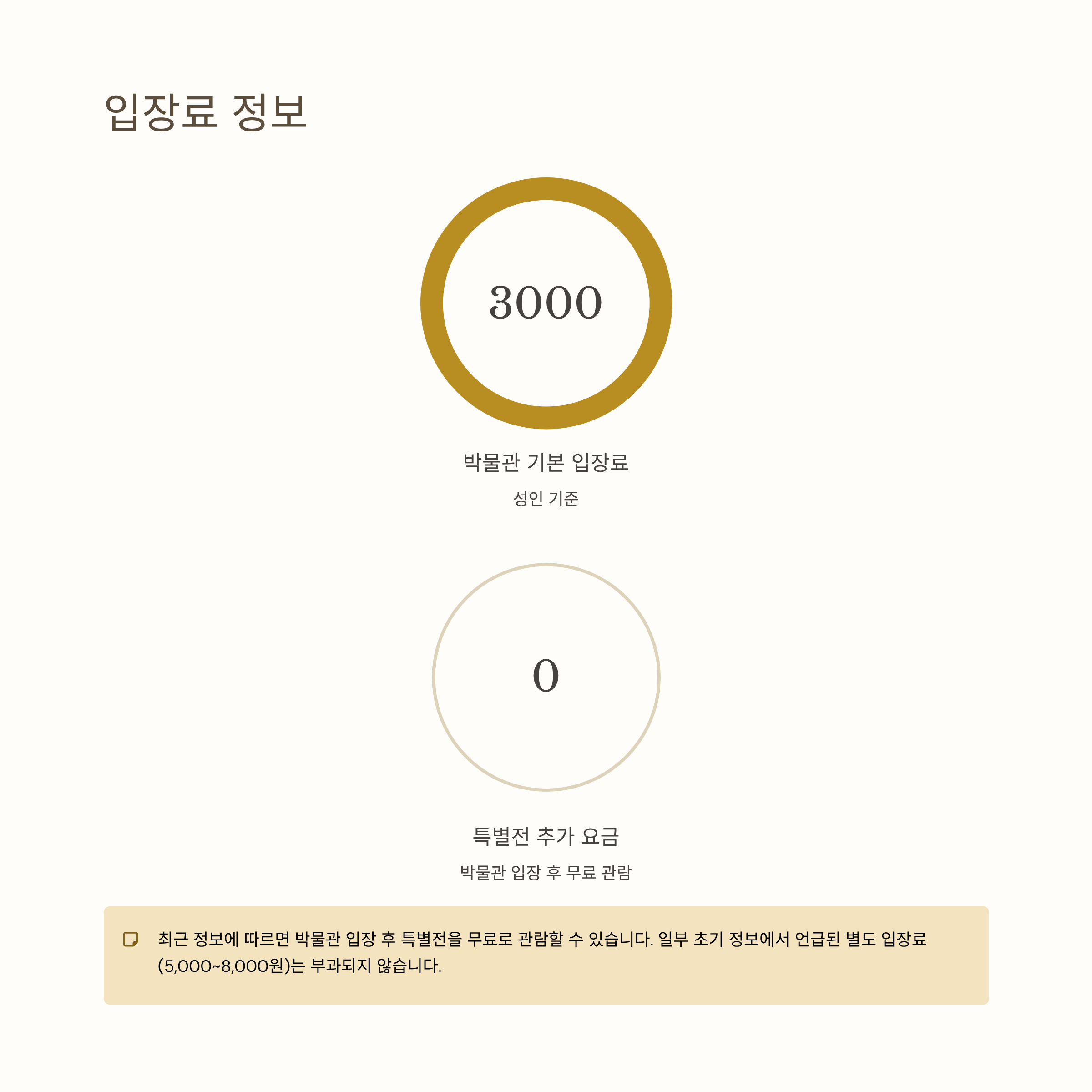 현재 박물관 기본 입장료는 성인 3,000원이며, 특별전은 박물관 기본 입장 시 무료로 관람 가능합니다. 일부 초기 정보에서는 특별전에 대한 별도 입장료(5,000~8,000원)가 부과될 가능성이 언급되었으나, 최근 정보에 따르면 박물관 입장 후 특별전을 무료로 관람할 수 있습니다.