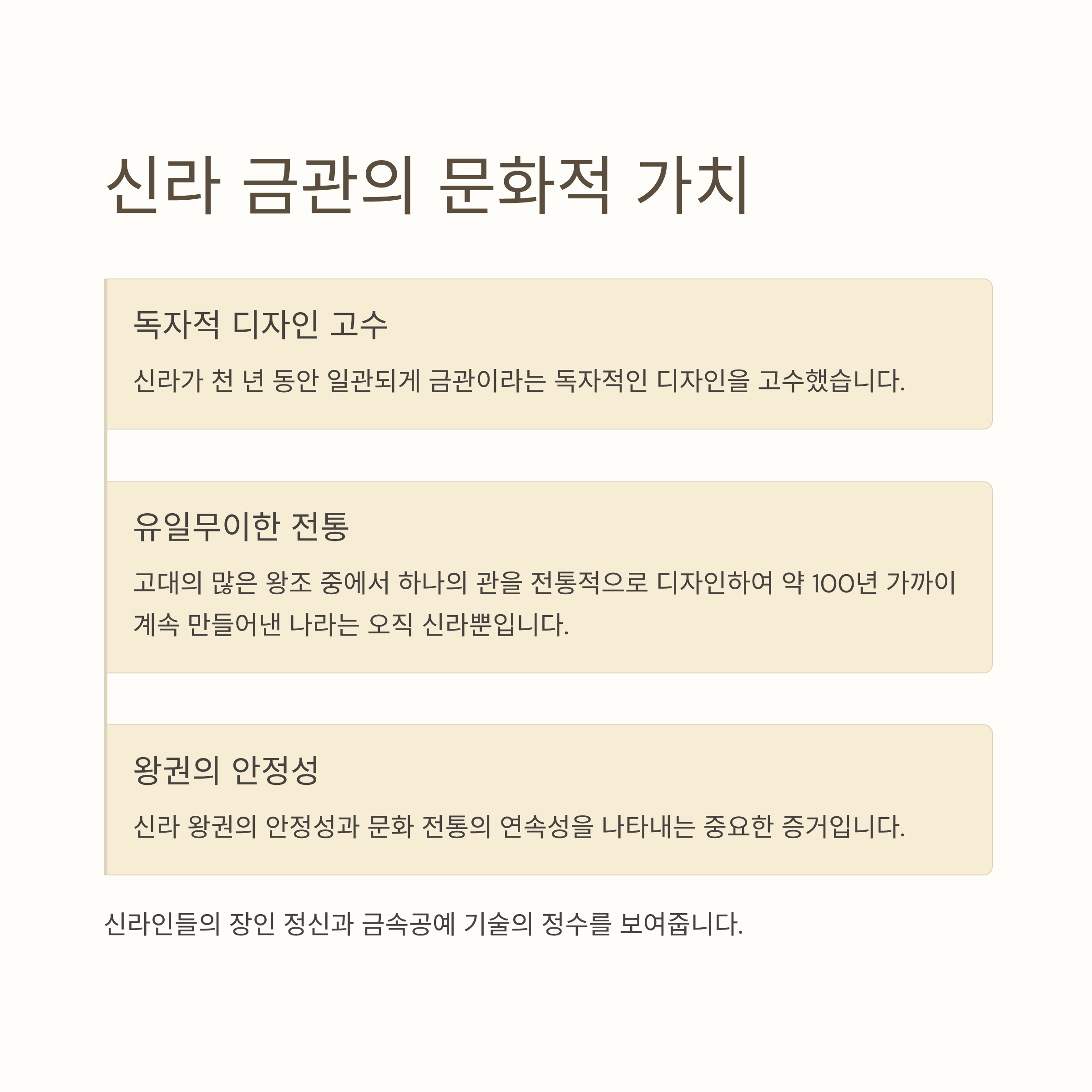 특히 주목할 점은 신라가 천 년 동안 일관되게 금관이라는 독자적인 디자인을 고수했다는 것입니다. 고대의 많은 왕조 중에서 하나의 관을 전통적으로 디자인하여 약 100년 가까이 계속 만들어낸 나라는 오직 신라뿐입니다. 이는 신라 왕권의 안정성과 문화 전통의 연속성을 나타내는 중요한 증거입니다.
