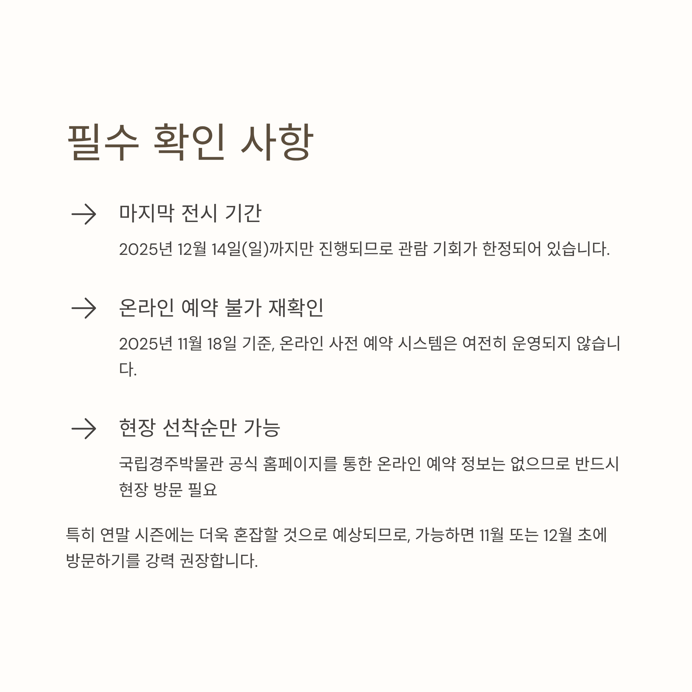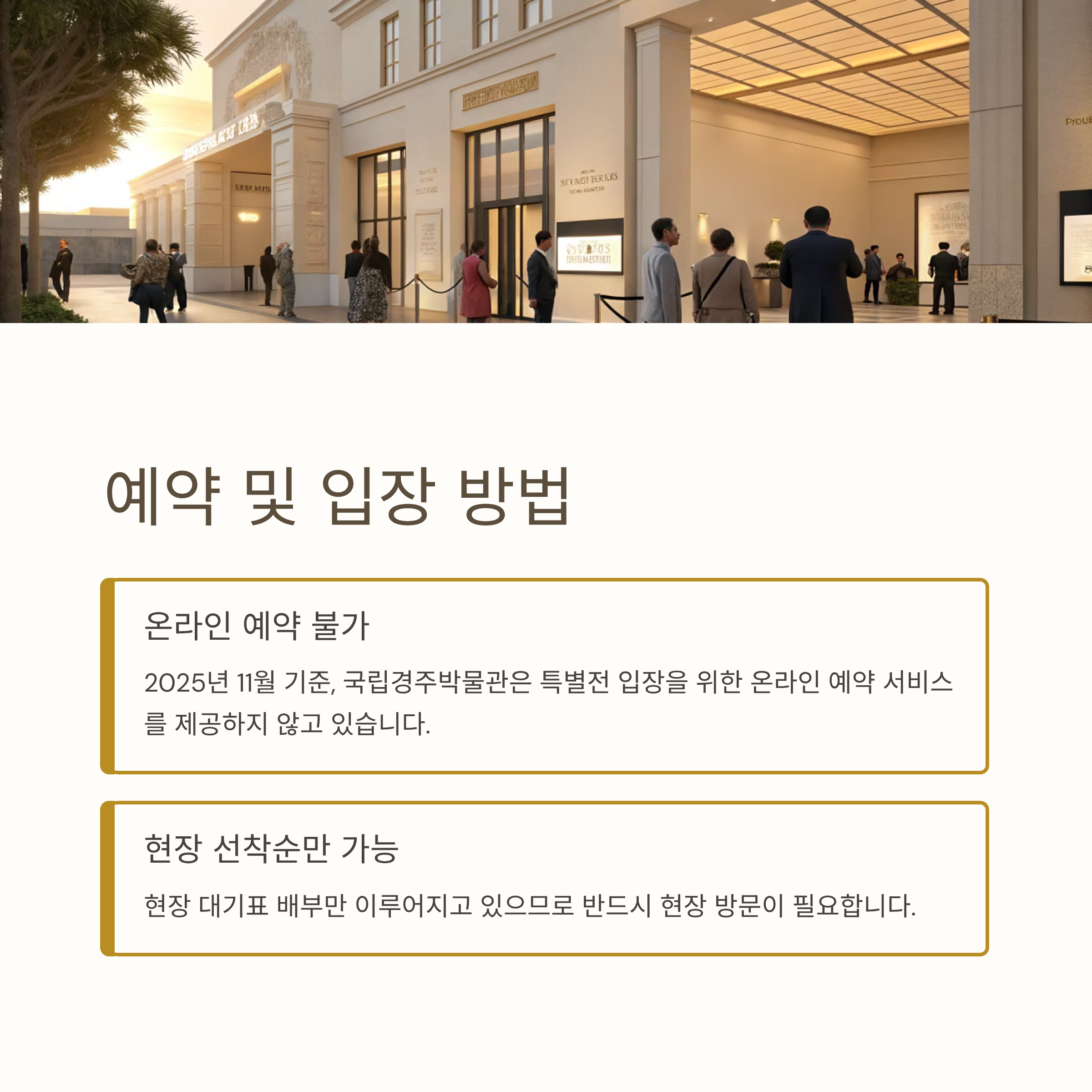 가장 중요한 정보는 이 특별전이 온라인 사전 예약 시스템을 운영하지 않는다는 점입니다. 2025년 11월 기준, 국립경주박물관은 특별전 입장을 위한 온라인 예약 서비스를 제공하지 않고 있으며, 현장 선착순 입장제만 운영되고 있습니다.