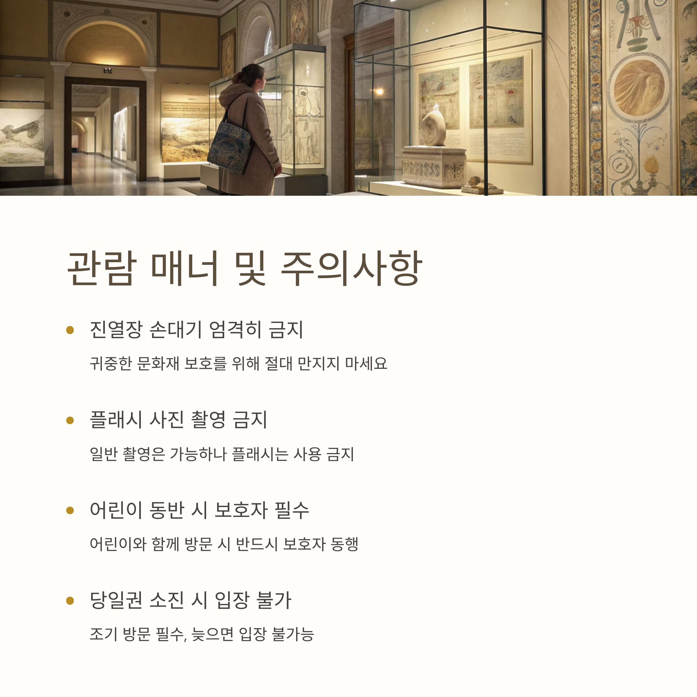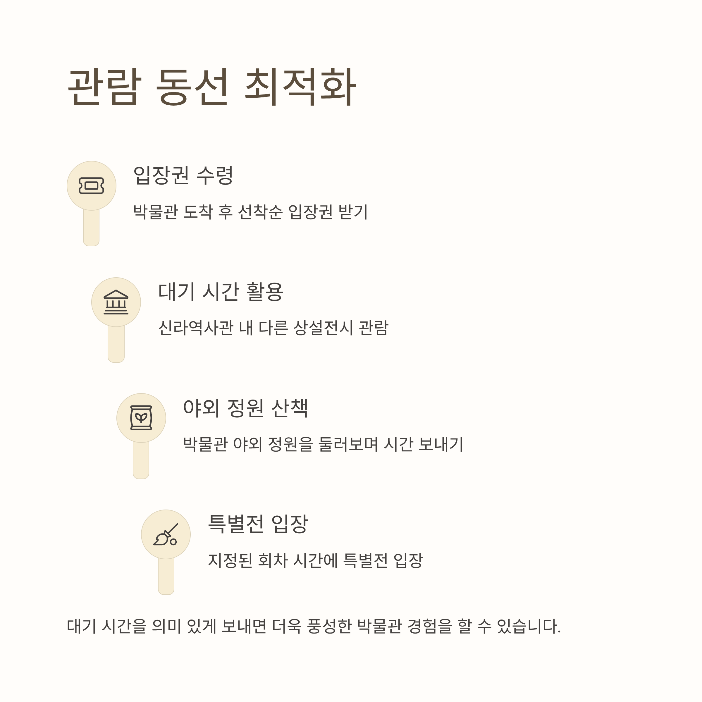 박물관에 도착한 후 입장권을 받고 지정된 회차 시간까지 남은 시간을 효율적으로 활용하세요. 신라역사관 내 다른 상설전시나 박물관 야외 정원을 먼저 둘러본 후 정해진 시간에 특별전에 입장하면 대기 시간을 의미 있게 보낼 수 있습니다.
