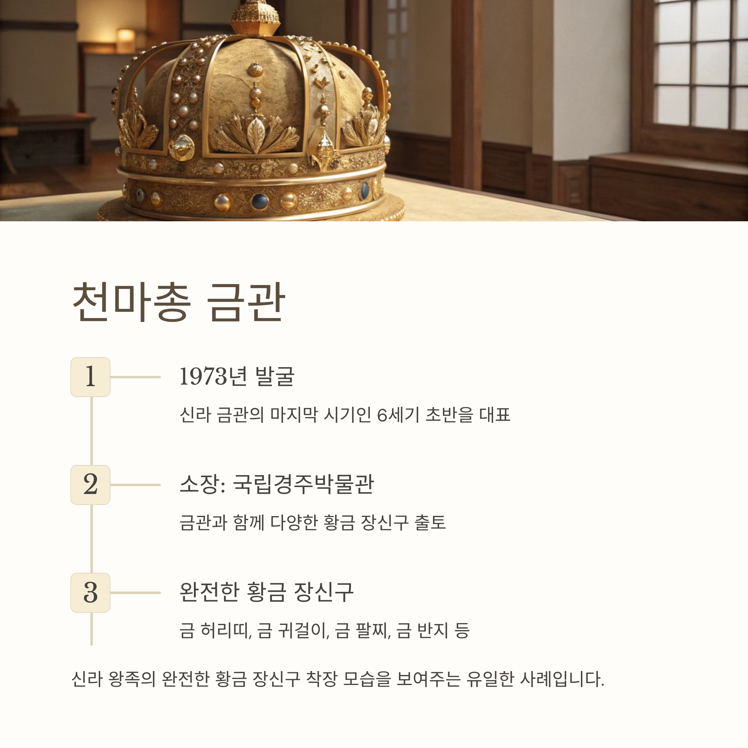 1973년에 발굴되었으며, 신라 금관의 마지막 시기인 6세기 초반을 대표합니다. 천마총에서는 금관과 함께 금 허리띠, 금 귀걸이, 금 팔찌, 금 반지 등 다양한 황금 장신구가 출토되어 신라 왕족의 완전한 황금 장신구 착장 모습을 보여줍니다.